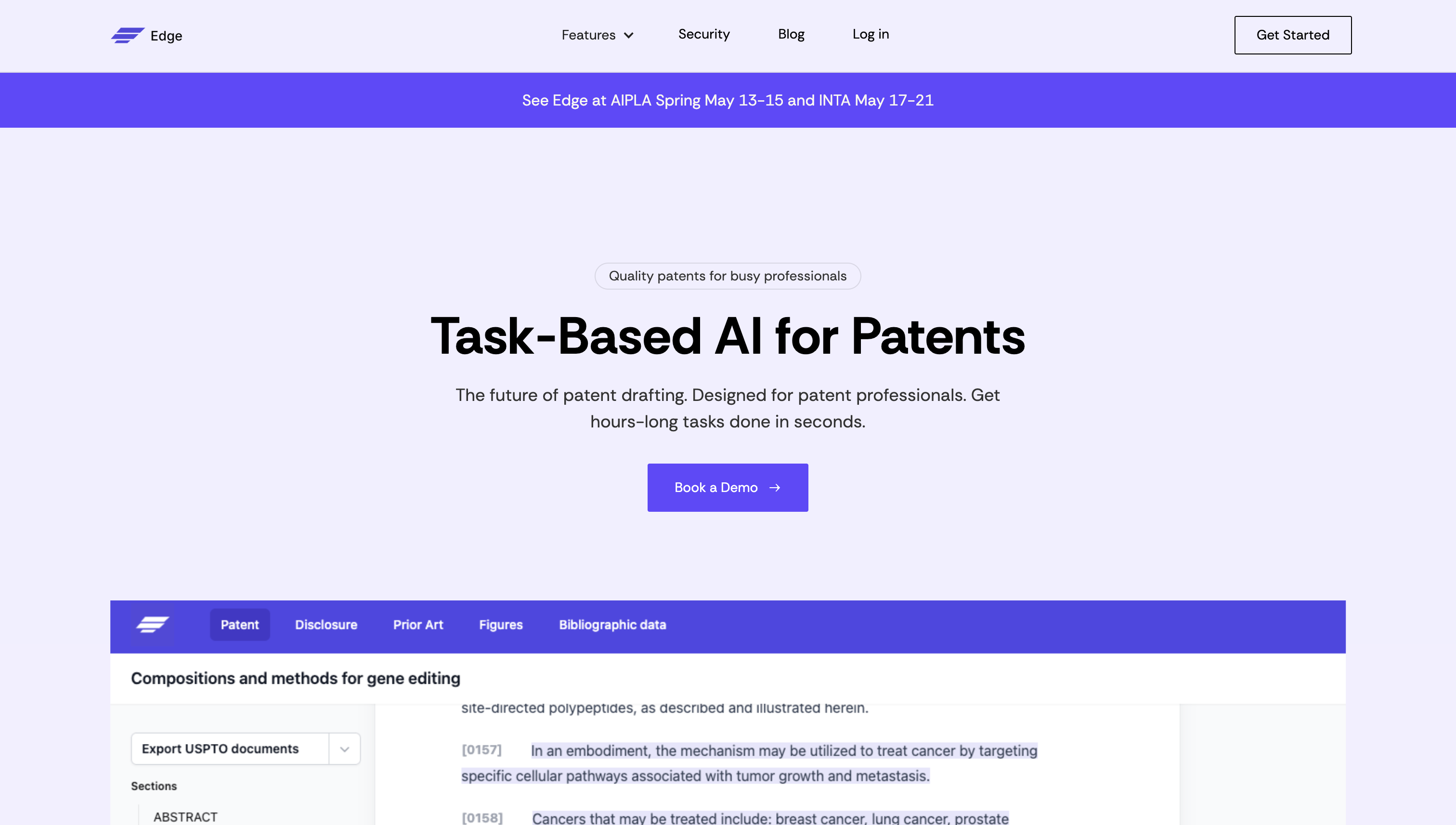 Edge is an AI-powered patent drafting platform with a strong emphasis on disclosure management and figure editing. It positions itself as a "strategic partner" for both inventors and legal professionals.