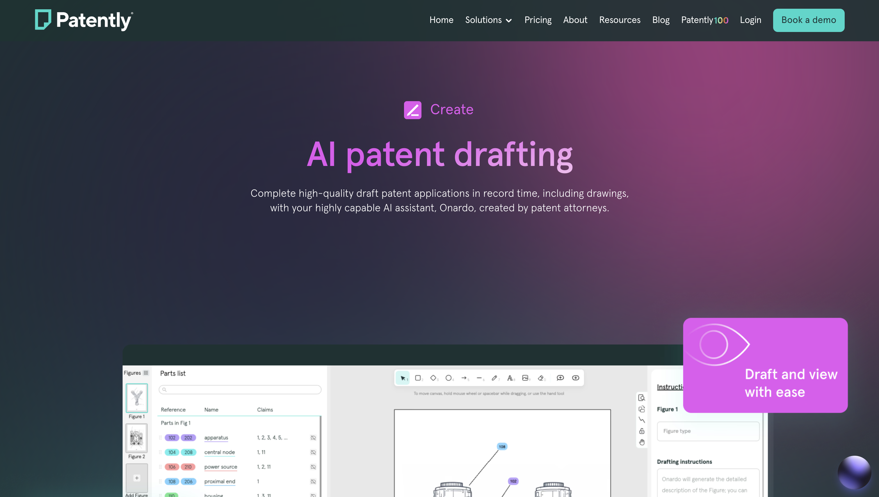 What makes it different: Patently Create includes an in-browser drawing editor where you can create, label, and manage figures alongside your specification text. The platform uses "Onardo," an AI assistant that extracts and organizes claim features, automates figure referencing, and generates natural language descriptions for each figure.